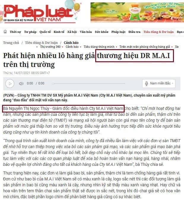 Sản phẩm Dr Mai là cái tên rất hot trên thị trường hiện nay, nhưng để tìm mua Dr Mai chính hãng thật sự rất khó với người tiêu dùng. (PLVN) - Công ty TNHH TM DV SX Mỹ phẩm Mai Việt Nam (Cty M.A.I Việt Nam), chuyên sản xuất mỹ phẩm đang “đau đầu” đối mặt với vấn nạn này.