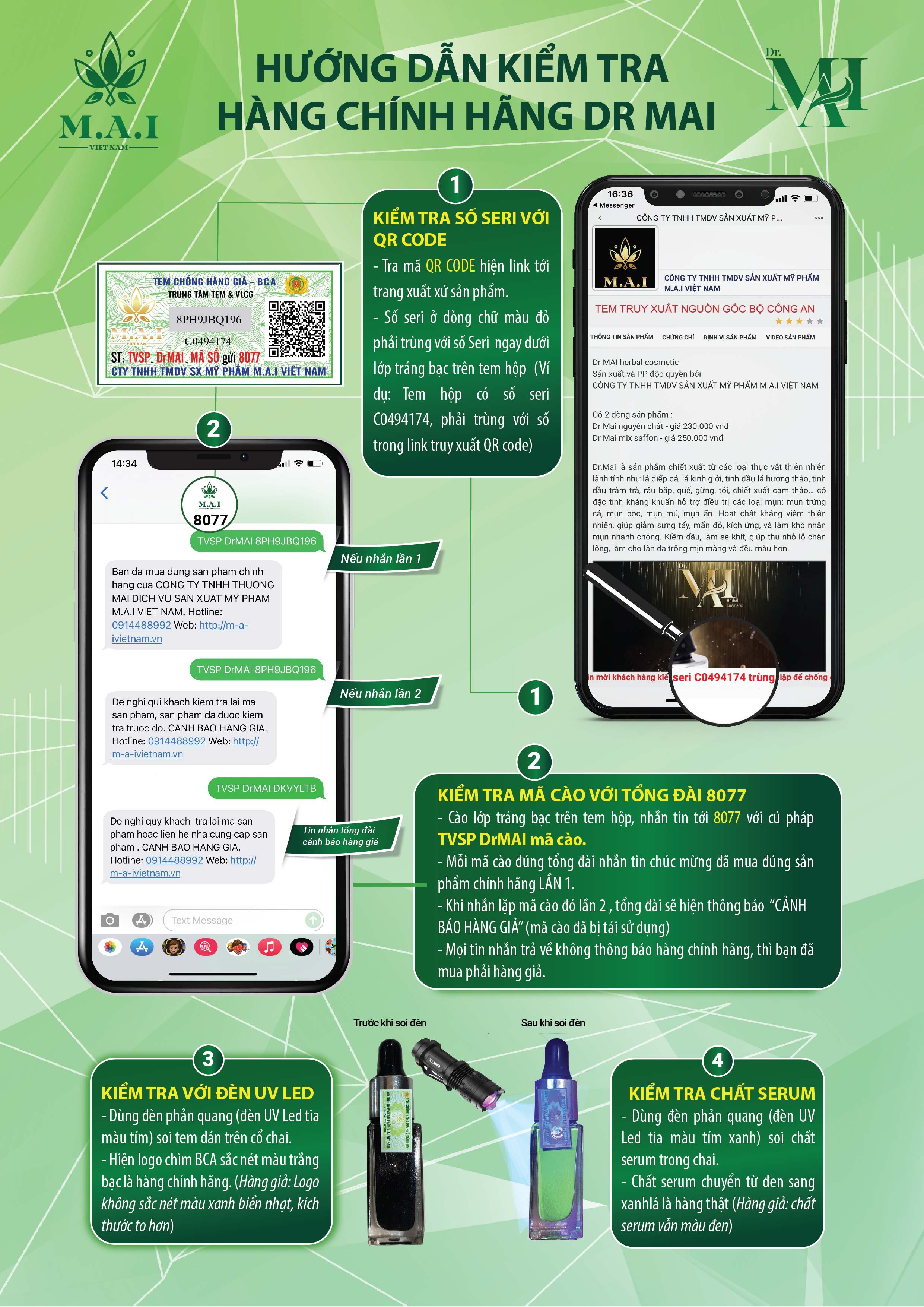 Công ty MAI Việt Nam giới thiệu website maithaomoc.org là nơi phân phối hàng chính hãng uy tín của công ty nhiều năm liền, sản phẩm Dr Mai đủ tiêu chuẩn chất lượng ISO9001:2015 - Khẳng định uy tín thương hiệu DR MAI trên thị trường mỹ phẩm Việt Nam. Quý khách khi mua hàng tại maithaomoc.org sẽ kiểm tra được đầy đủ các bước phân biệt hàng chính hãng