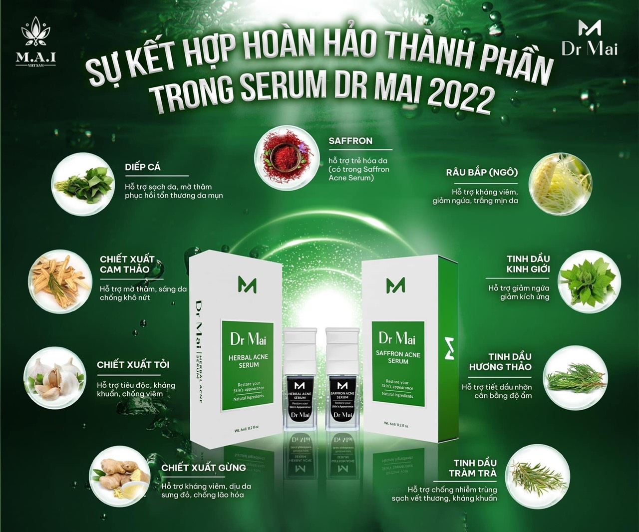 Trong khi đó, Dr Mai Mix saffron lại có công dụng chủ đạo về cấp ẩm, hỗ trợ trị vết thâm hơn là hỗ trợ trị mụn.