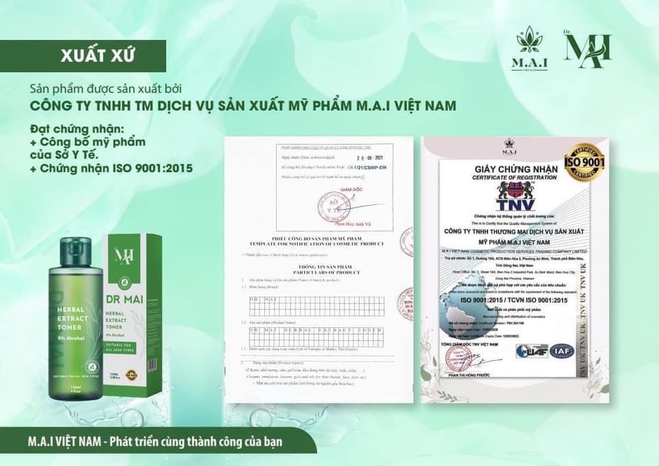 Thấu hiểu được nhu cầu cần thiết của khách hàng công ty M.A.I Việt Nam cho ra mắt dòng sản phẩm mới đó là Toner Dr Mai. Toner Dr Mai là sản phẩm hỗ trợ kháng viêm, giảm mụn, nhờ chiết xuất từ các thành phần thảo mộc thiên nhiên. Với dạng hợp chất nước, lỏng, có khả năng len lỏi vào sâu lỗ chân lông và giúp se khít lỗ chân lông. Bằng khả năng thẩm thấu cao, toner còn có thể thấm sâu vào đến 10 – 30 lớp tế bào. Chúng thường được dùng như một bước đệm cho các bước dưỡng da sau đó.